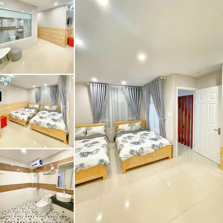 - Khách sạn: 2 hầm, 1 trệt, 2 lầu, gồm 1 sảnh lễ tân, 1 bếp, 1 phòng thờ, 14 phòng ngủ, 15wc.